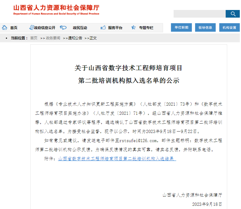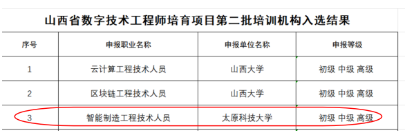 近日,山西省人力资源和社会保障厅网站发布关于山西省数字技术工程师培育项目第二批培训机构拟入选名单的公示,我校成功获批国家数字技术工程师培育项目第二批智能制造培训机构。