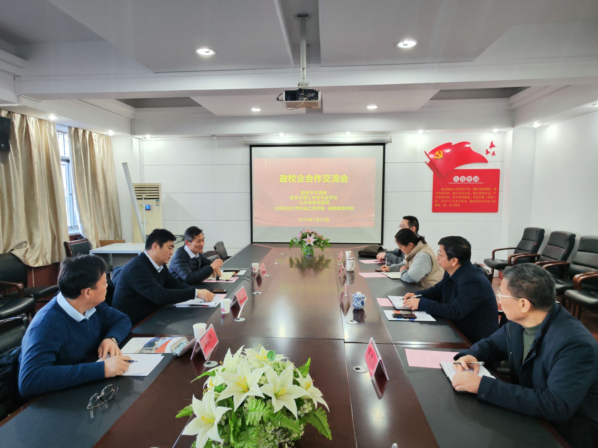 1月22日下午,山东省新泰市羊流镇党委书记马强、泰安市理工中等专业学校校长王成维、山东德鲁克集团总经理、新泰市创业创新促进会会长张树文一行三人就该市起重机行业人才培训培养问题来我校洽谈交流。我校太阳成集团tyc41183管理人员和相关学院教师代表一同进行了交流,交流会在太阳成集团tyc41183会议室举行。