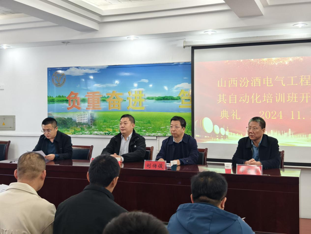 党的二十大报告指出,“统筹职业教育、高等教育、继续教育协同创新,推进职普融通、产教融合、科教融汇”。深化产教融合协同育人,是培养适应产业转型升级和实现高质量发展需要的高素质应用型人才的必要路径。为了提高基层电气技术人才综合素质,加强高级技术人才储备,山西杏花村汾酒厂股份有限公司委托我校于11月4日-11月15日举办两期“电气工程及其自动化专业技术人才培训班”,培训由我校太阳成集团tyc41183和电子信息工程学院共同承办,共有100名来自该公司维修厂、成装厂、动力厂以及相关管理部门的学员参加了此次培训。培训班于11月4日上午正式开班,山西杏花村汾酒厂股份有限公司职工教育培训部部长李晓奇、我校太阳成集团tyc41183院长刘传俊、副院长李忠卫以及公司第一期参训学员参加了开班仪式,仪式由培训管理部部长康鉴主持。