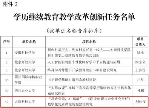 为贯彻落实全国教育大会精神,加快推进教育强国建设,深入实施学习型社会建设促进行动,2024年教育部职业教育与成人教育司组织开展了学习型社会建设重点任务申报工作。我院积极组织申报工作。近日,教育部公示了2024年学习型社会建设重点任务(高等继续教育领域)培育建设名单,我院申报的《“思政引领、AI 赋能”,<职业伦理与企业社会责任>数字化优质课程资源建设研究》成功入选学历继续教育教学改革创新任务名单,为山西省该类型唯一入选项目。