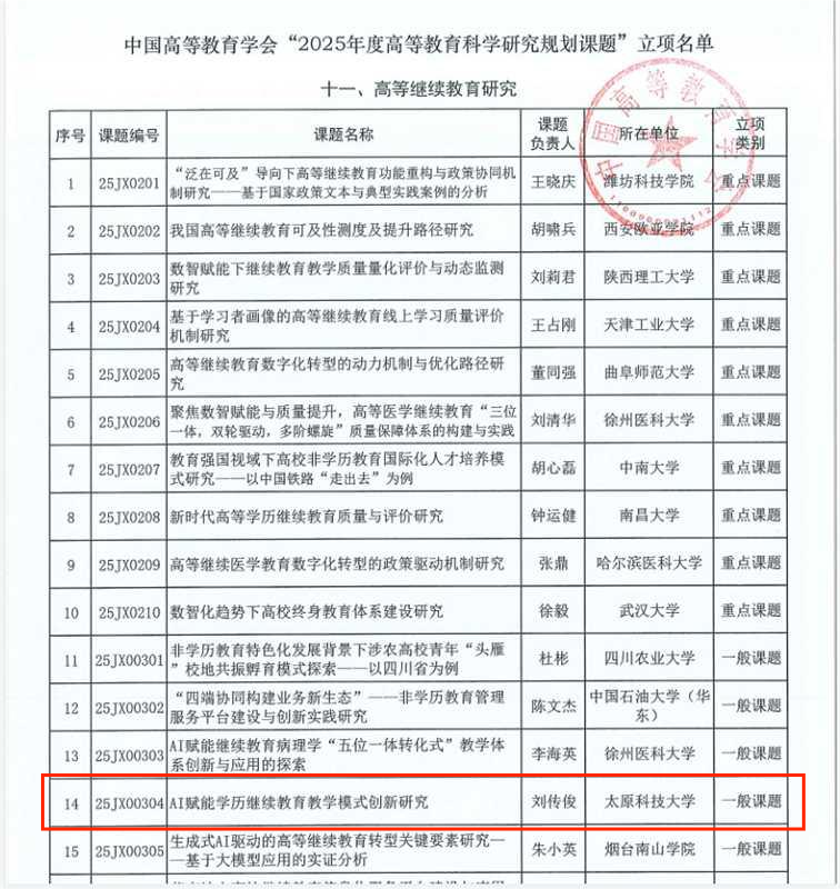 近日,中国高等教育学会公布2025 年度高等教育科学研究规划课题立项名单,我院刘传俊院长主持的《AI 赋能学历继续教育教学模式创新研究》成功入选,为学院深化教学改革、提升教学质量,以及推动继续教育数字化转型奠定坚实基础。