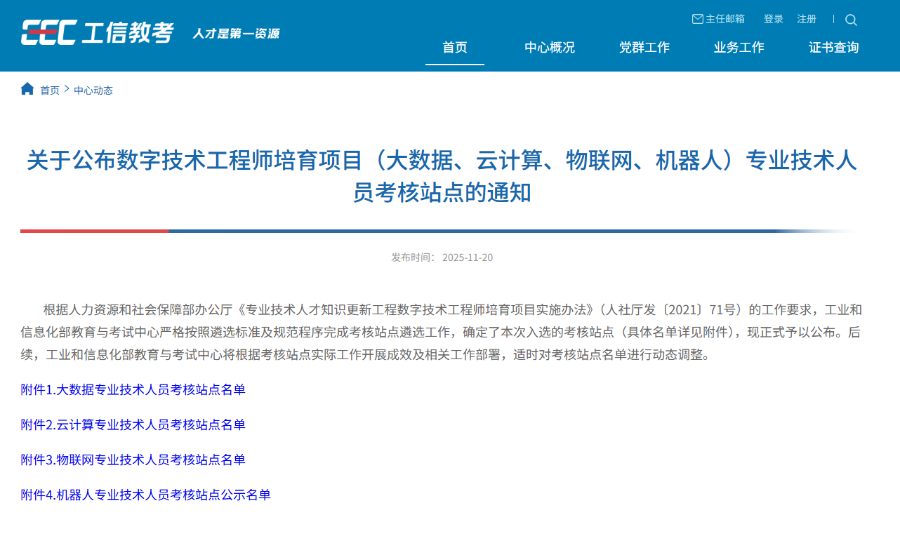 近期,工业和信息化部教育与考试中心发布数字技术工程师培育项目专业技术人员考核站点公示通知,我校成功获批大数据、物联网、机器人三个专业领域的数字技术工程师考核站点。此次考核站点的获批,标志着我校在数字技术人才培育的“培训-考核”全链条发展上迈出关键一步。